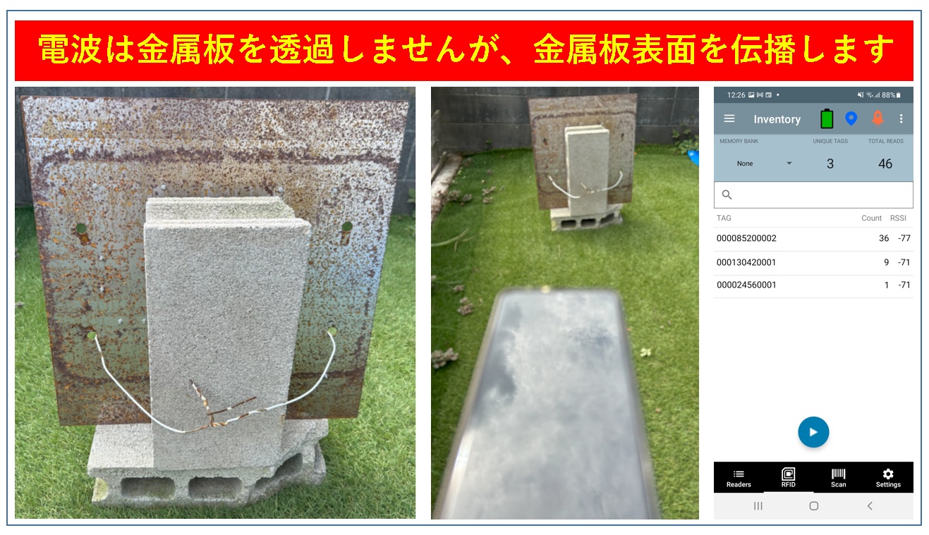 今回の実験においては、電波の反射により、タグ正面側の電波経路で認識されているのではない事は、幾つかの検証を組み合わせて確認しています。